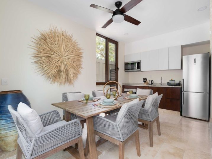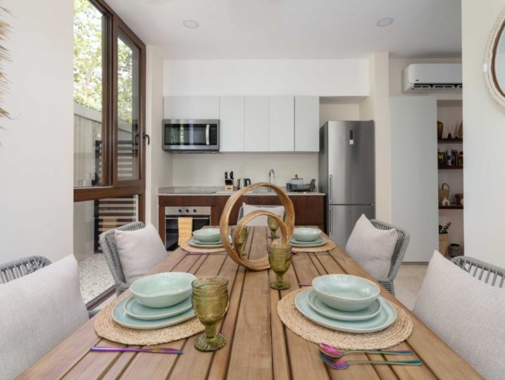 Comedor y cocina equipados por si te sientes con ganas de cocinar en tu casa de playa.