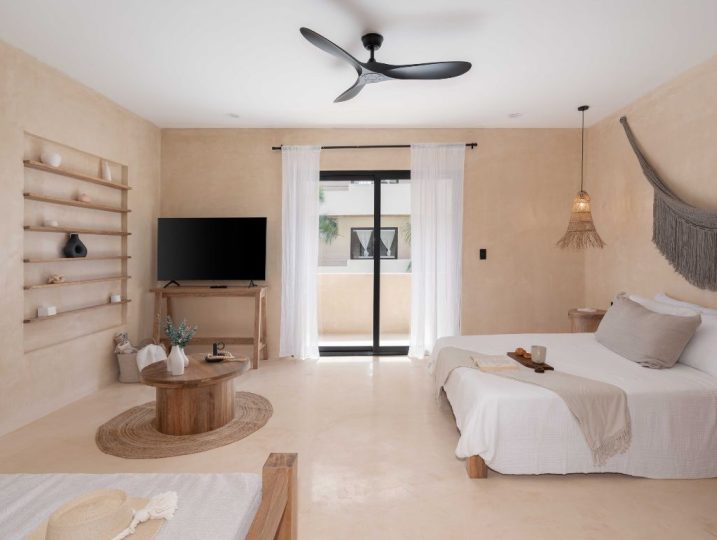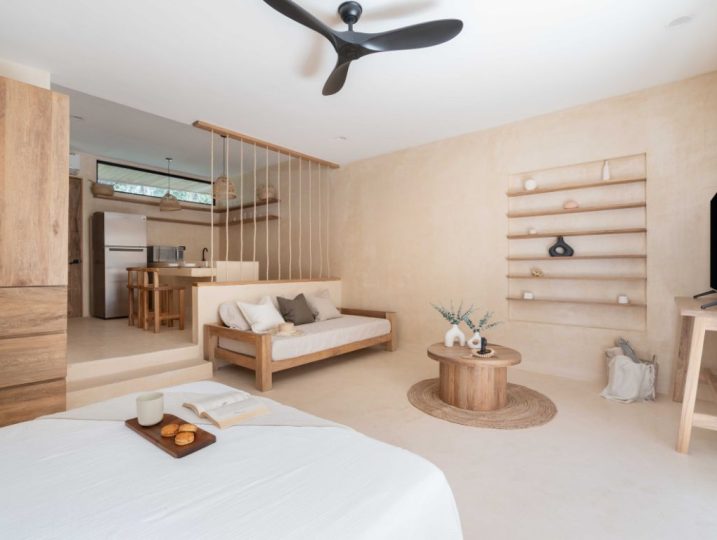 Cocay Lofts Tulum, un paraíso selvático a medio camino entre la playa/Zona Hotelera y el centro de Tulum. disfruta de la piscina de 400 pies y su majestuosa cascada de 7 m de altura. Amplio condominio tipo loft, terraza y tina privada, cocina totalmente equipada, cama Queen + sofá cama (individual), televisión, internet,